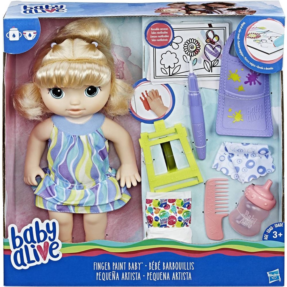 Com seu pincel mágico você pode pintar a mão de sua filhinha para deixá-la vermelha e brincar de carimbar o papel. Inclui uma boneca loira, um conjunto de roupa, avental, cavalete, 2 quadros de pintura, mamadeira, pincel, lencinho, fraldinha e pente.