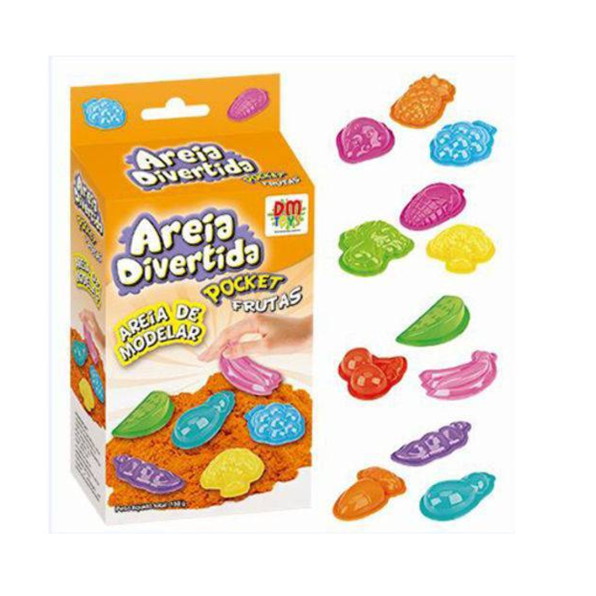 Em cada kit vem um pacote com a sua areia mágica e três moldes de frutas para seus filhos se divertirem.