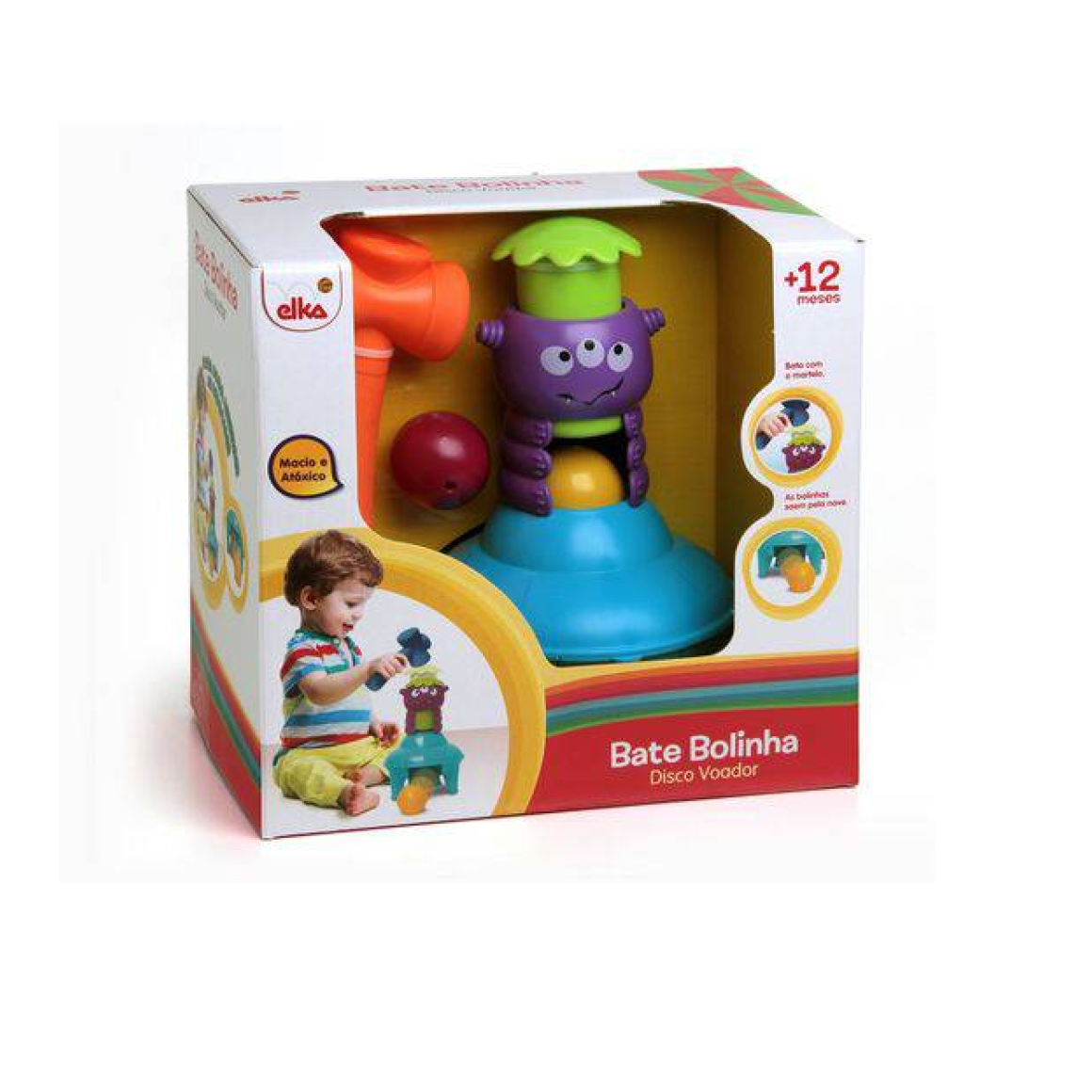 O Alien só quer comer bolinhas! Liberte as bolinhas martelando sua cabeça! Coloque as bolinhas no Alien, martele e libere-as pela nave, a portinha abre e as bolinhas saem! Cores e formas que estimulam os sentidos da criança.