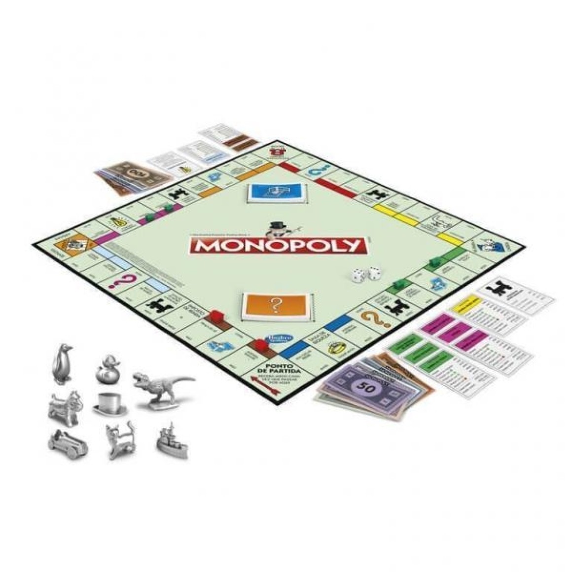 Itens Inclusos:Tabuleiro, Adesivo para o tabuleiro, Cartela de cartas (Títulos de posse, Listas de Sorte e Cofre, 4 Cartas Saia da Cadeia de Graça), 4 Peças de Plástico, Dinheiro MONOPOLY, 3 Dados, 32 Casas, 12 Hotéis e Regras.