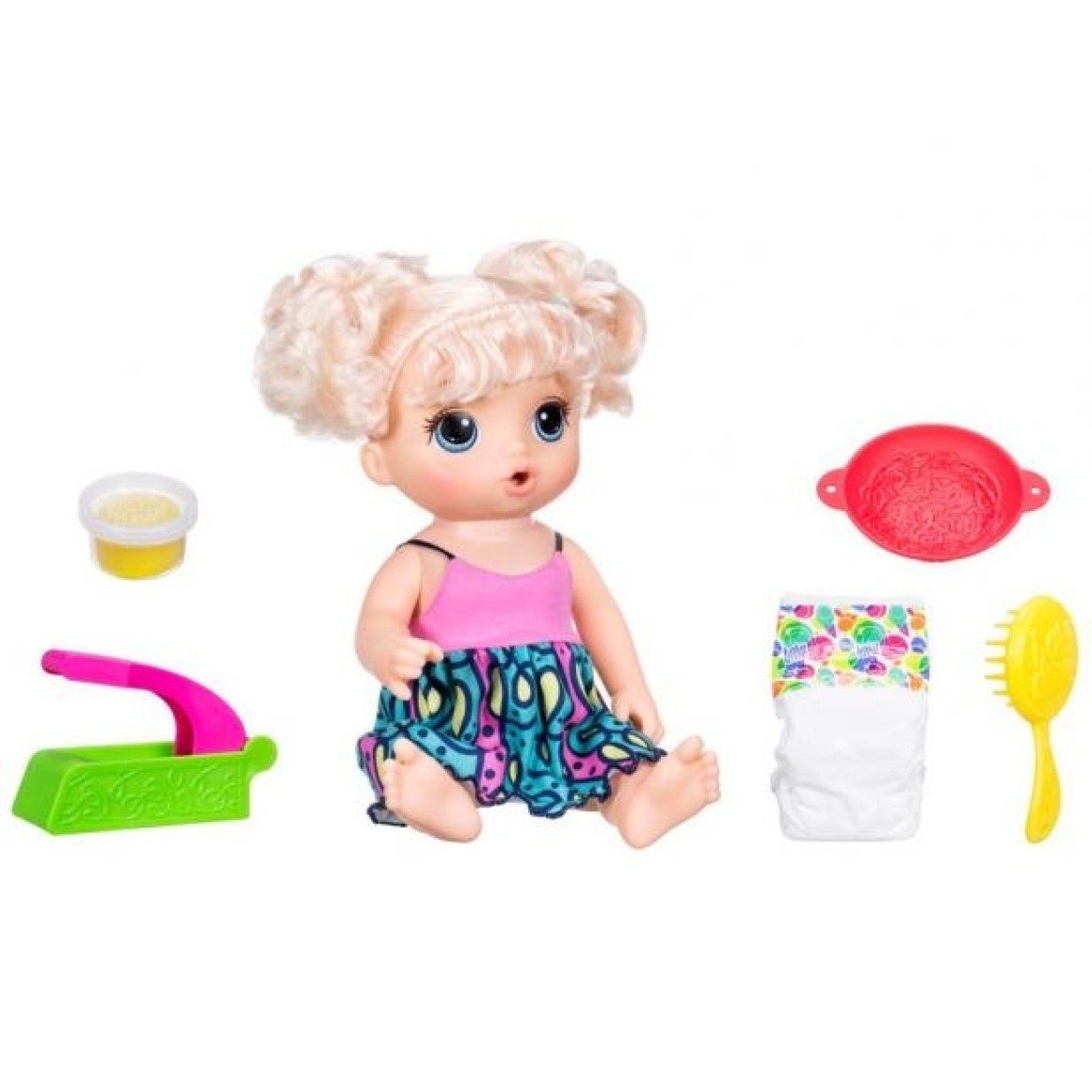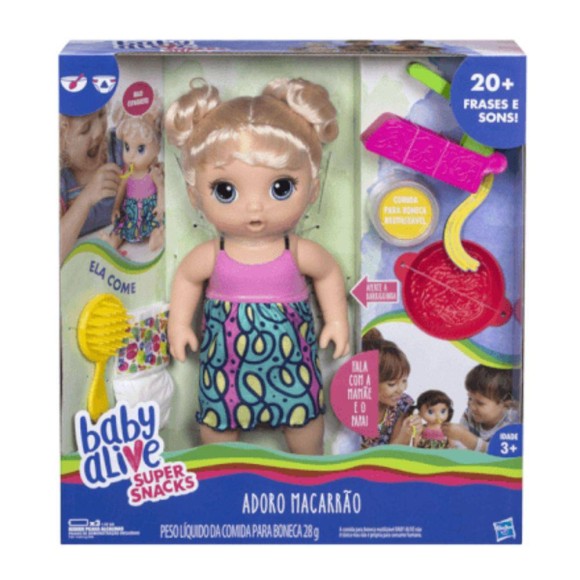 Está na hora de preparar a refeição da sua filhinha e com a Baby Alive Adora Macarrão você mesmo pode fazer o espaguete com a maquininha. Quando ela estiver com fome, coloque um espaguete por vez em sua boca até ficar satisfeita. Ela come muito e faz caquinha! Além de chamar a mamãe, ela também chama o papai para completer a brincadeira! Inclui uma boneca loira, um conjunto de roupa, uma fabriquinha de massas, um refill de comida, tigela, fraldinha e escova de cabelo. Possui modo Papai e Mamãe.
