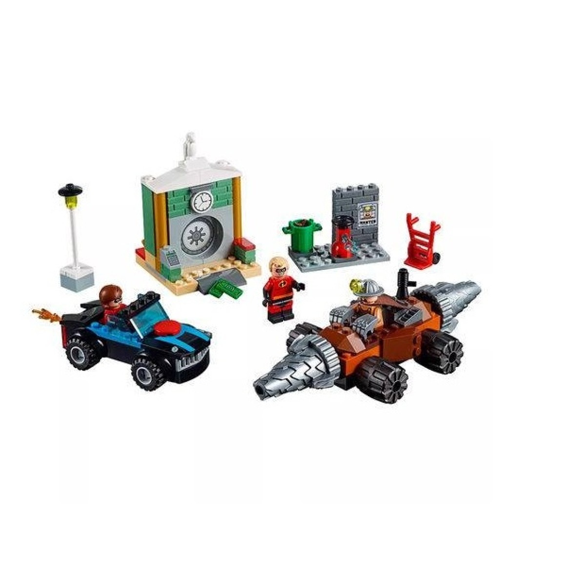 Acenda a imaginação de seu filho para alguns Lego® Juniors Os Incríveis 2, com este emocionante jogo Underminer Bank Heist, com cofre de banco com porta separável, veículo Incrível com chassi Quick Start, máquina Tunneler com chassi Quick Start e brocas giratórias, mais uma construção de rua com parede de tijolos, cartaz de procurado e poste edificável. Este brinquedo divertido para meninos e meninas também inclui um guia simples para construir e jogar, para ajudar a construir a confiança em crianças de 4 a 5 anos. Inclui 3 mini figuras.Apresenta um cofre de banco com porta separatista e uma cena de rua com parede de tijolos, cartaz de procurado e um poste de iluminação edificável.Também inclui 2 veículos: um chassi Incredibile com Quick Start e uma máquina Tunneler com chassi Quick Start e brocas giratórias. Os elementos acessórios incluem 2 notas de dinheiro, 2 elementos de barra de ouro, elemento de diamante, pepita de ouro, saco de saque, lixeira, lata de refrigerante, vara e um carrinho de mão.