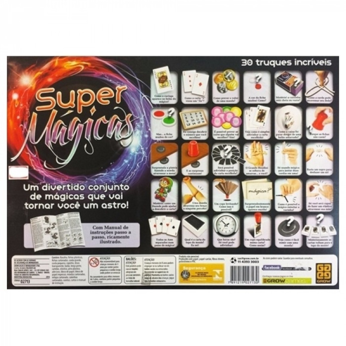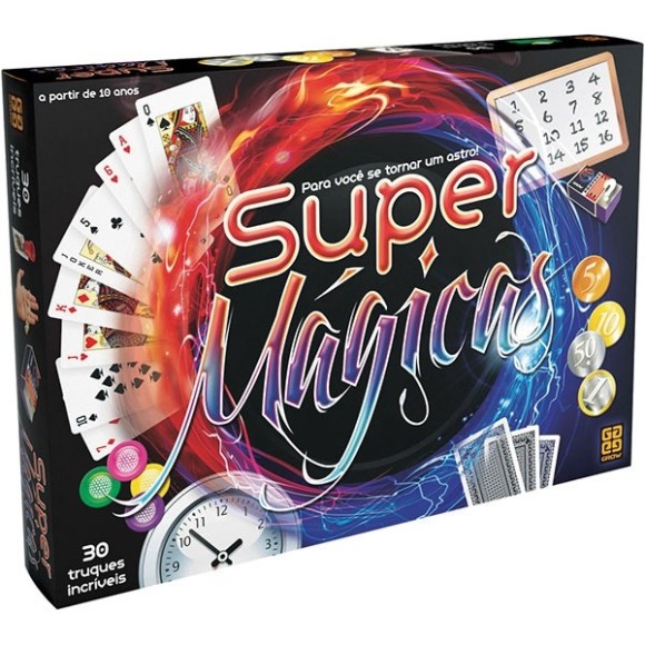 GROW- Jogo Super Mágicas-02713 Truques que vão surpreender a sua plateia! Super Magicas traz copinho que atravessa a mesa, cordas mágicas, moedas que aparecem e desaparecem e muitas mágicas com cartas para deixar todos boquiabertos! Características: Código 23303007 Código de barras 7908010127133 Composição Baralho, fichas, cordões, copinho, balão, lenço preto, cartelas, adesivos, bloco de papel, bloco de papel impresso, moedas cartonadas, relógio cartonado, caixinhas cartonadas, varetas, cartas e manual de instrução. Marca Grow