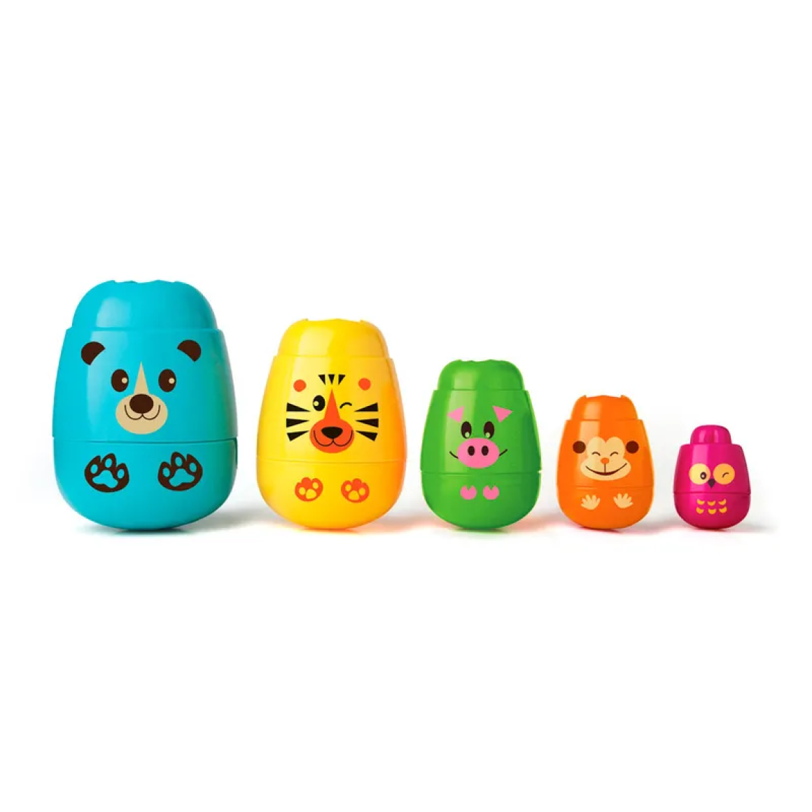 A Matrioska da Elka é pura diversão, a cada abertura a criança descobre um animal, são empilháveis, possuem a base arredondada como um João-bobo, coloridas e fáceis de encaixar.