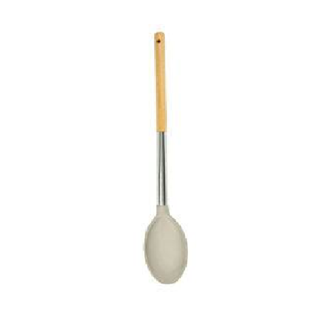 Colher de silicone com cabo de madeira e aço inoxidável.