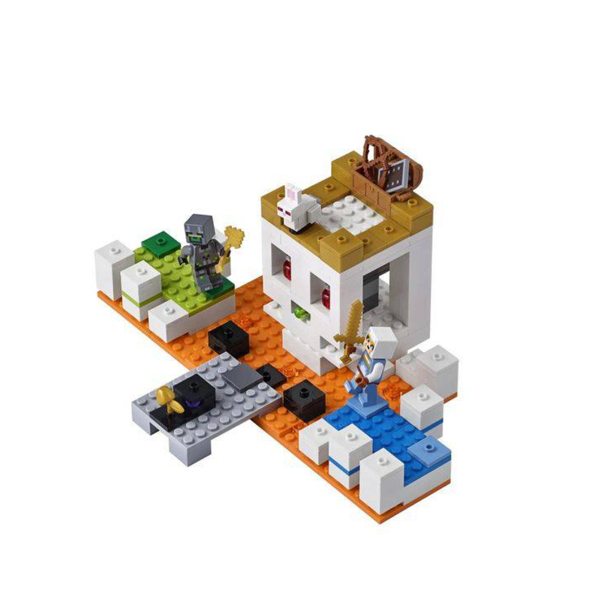 Evite o atirador de lodo e derrote seu oponente para reivindicar o prêmio de maçã de ouro, e lute contra o coelho assassino para obter as poções de cura e um baú contendo um escudo e arco! Inclui 2 mini figura, cada um com sua própria capa exclusiva de Minecraft, além de uma figura de coelho assassino. Apresenta um cenário Lego Minecraft Skull Arena construível com uma estrutura grande em forma de caveira, lava, pódios de jogadores verdes e azuis, plataforma com maçã dourada e um atirador de míssil que dispara um elemento de míssil lodo.