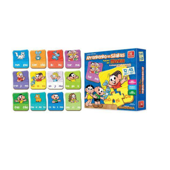 Sílabas Turma da Mônica, contém 45 peças em madeira.A partir de 7 anos, auxilia a criança a desenvolver o raciocínio lógico, noção espacial e concentração.