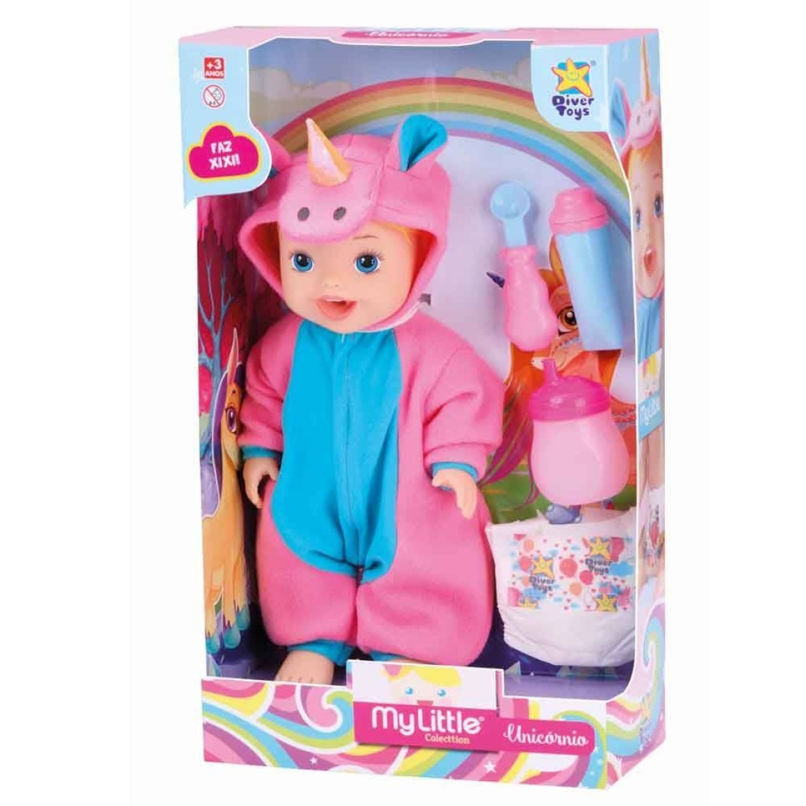 Vem com pijama de unicórnio, escova e pasta de dentes, mamadeira e fraldinha