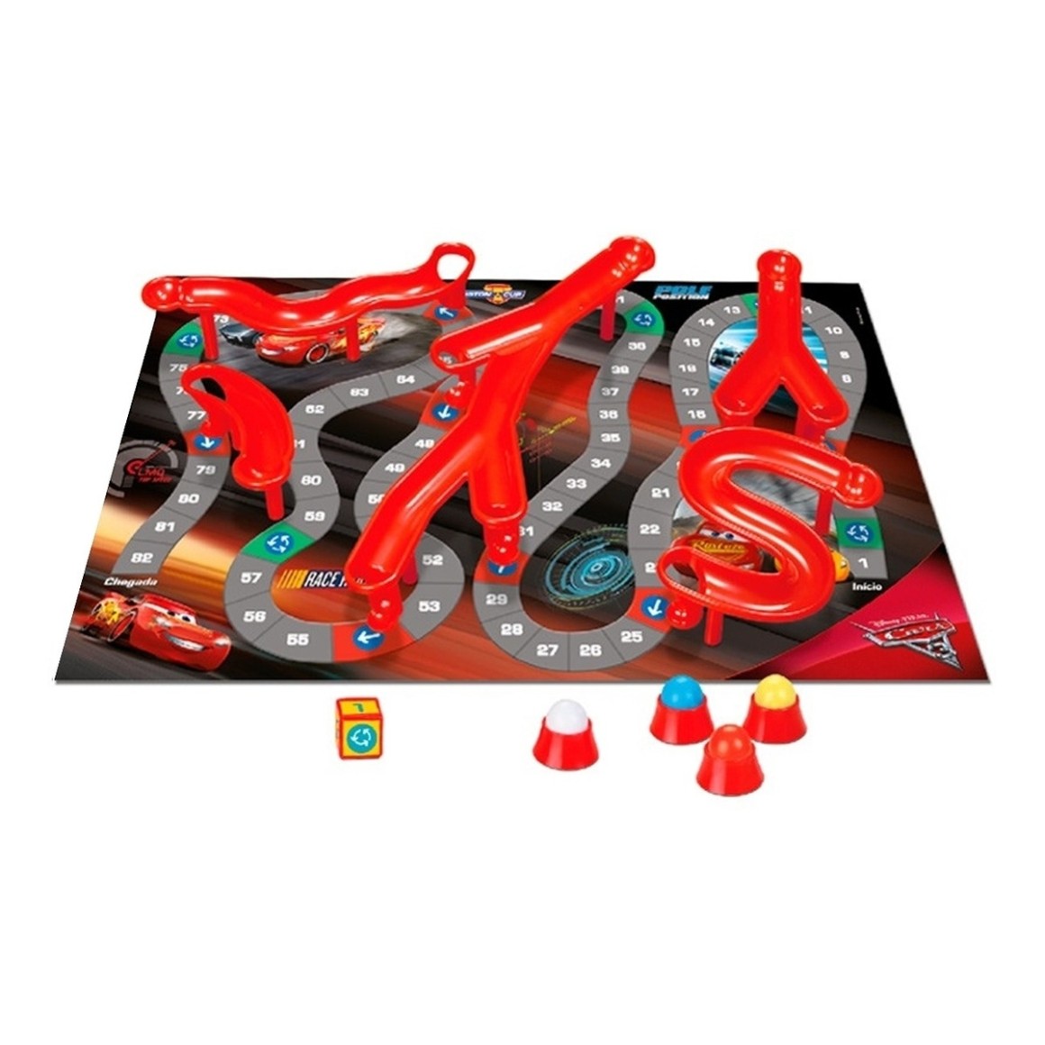 Cada jogador é representado por uma bolinha que desliza pelas pistas plásticas.