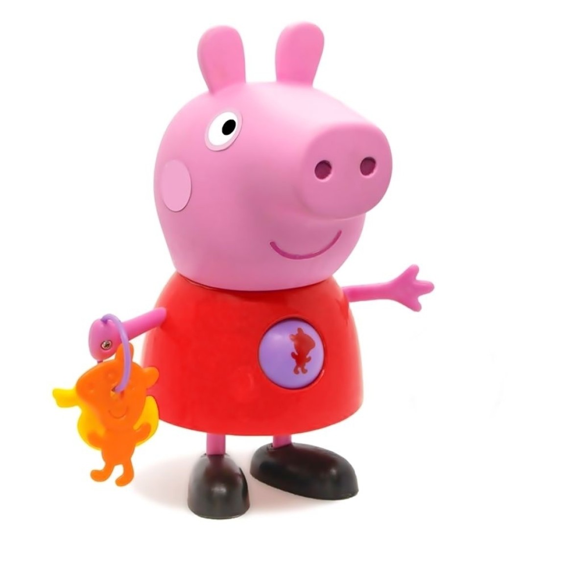 Boneco com 24 cm de altura, bolinha que gira na barriguinha, e os brinquedos preferidos dela na mãozinha.