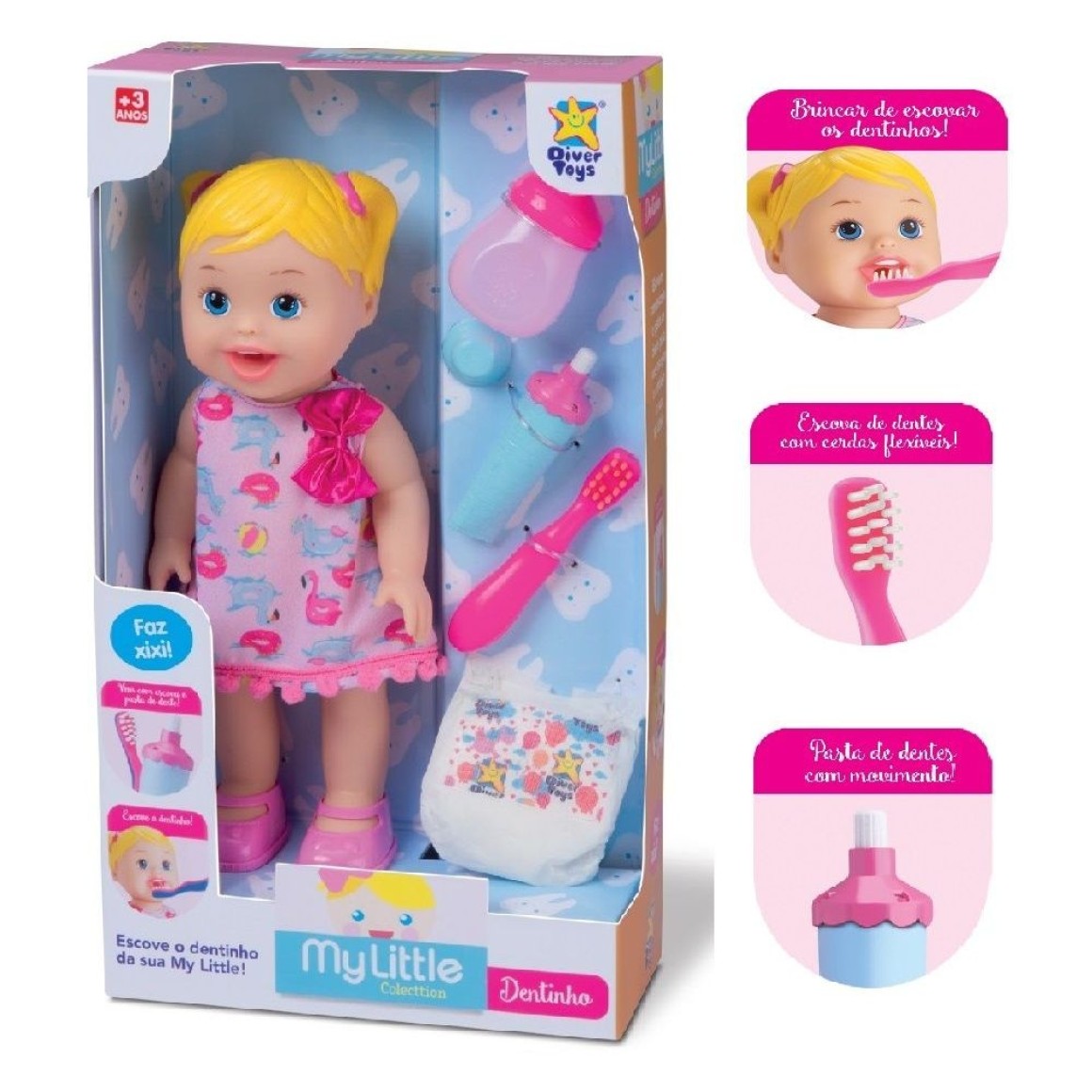 My Little Collection Dentinho é um lindo bebê que a criança simula uma escovação dental e da mamadeira e a boneca ainda faz xixi "de verdade" e vem com acessórios para que sua filha possa cuidar dela como uma bebe de verdade estimulando assim o relacionamento afetivo e aprendizado.
