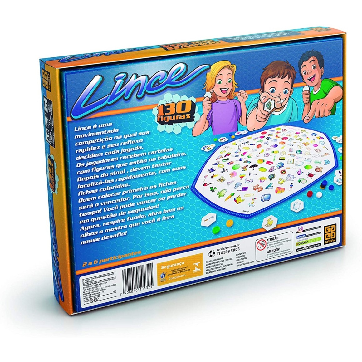 Lince é uma movimentada competição na qual sua rapidez e seu reflexo decidem cada jogada. Todos os jogadores recebem as cartelas com figuras que estão no tabuleiro. Depois do sinal, devem tentar localizá-las rapidamente, com suas fichas coloridas. Quem colocar primeiro as fichas será o vencedor. Por isso, não perca tempo! Você pode vencer ou perder em questão de segundos! Agora, respire fundo, abra bem os olhos e mostre que você é fera neste desafio!Fabricante - GrowItens inclusos - 1 tabuleiro - 1 saco plástico - 18 fichas - 130 cartelas ilustradas e 1 manual de instruçõesCódigo do fabricante - 00432Número de Jogadores para - 2 a 6 jogadoresTempo de jogo aproximadamente - 10 minutosGarantia - 3 meses prazo de validade - indeterminadoPaís de origem - BrasilIdade recomendada - recomendado maiores de 5 anos de idadeSelo de segurança do Inmetro - CE-BRI/ICEPEX-N 01264-25 003737/2019 - Ocp 0046Aviso - as cores podem variar entre as imagens mostradas acima e o produto